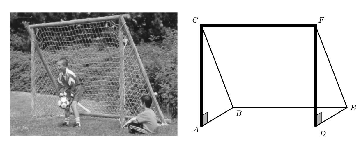 A figura à direita representa um esquema da baliza da figura da esquerda. Os triângulos $[A B C]$ e $[D E F]$ são retângulos em $A$ e em $D$, respetivamente. $[B E F C]$ é um retângulo.