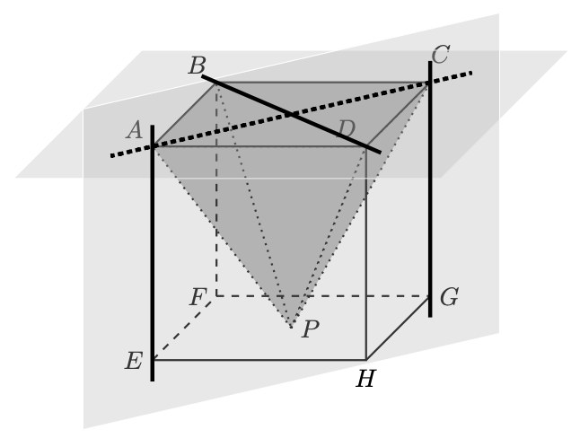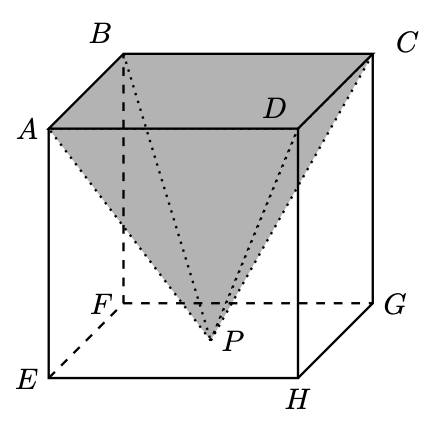 $\mathrm{O}$ vértice $P$ da pirâmide pertence à face $[E F G H]$ do cubo.