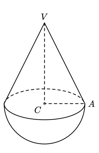 A base do cone e a semiesfera têm centro no ponto $C$ e têm raio $\overline{A C}$.