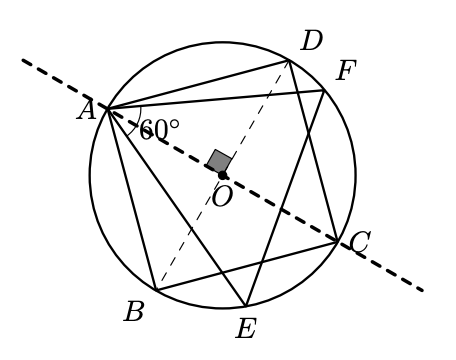 Estão também representados o triângulo $[A E F]$ e o quadrado $[A B C D]$, cujos vértices pertencem à circunferência.