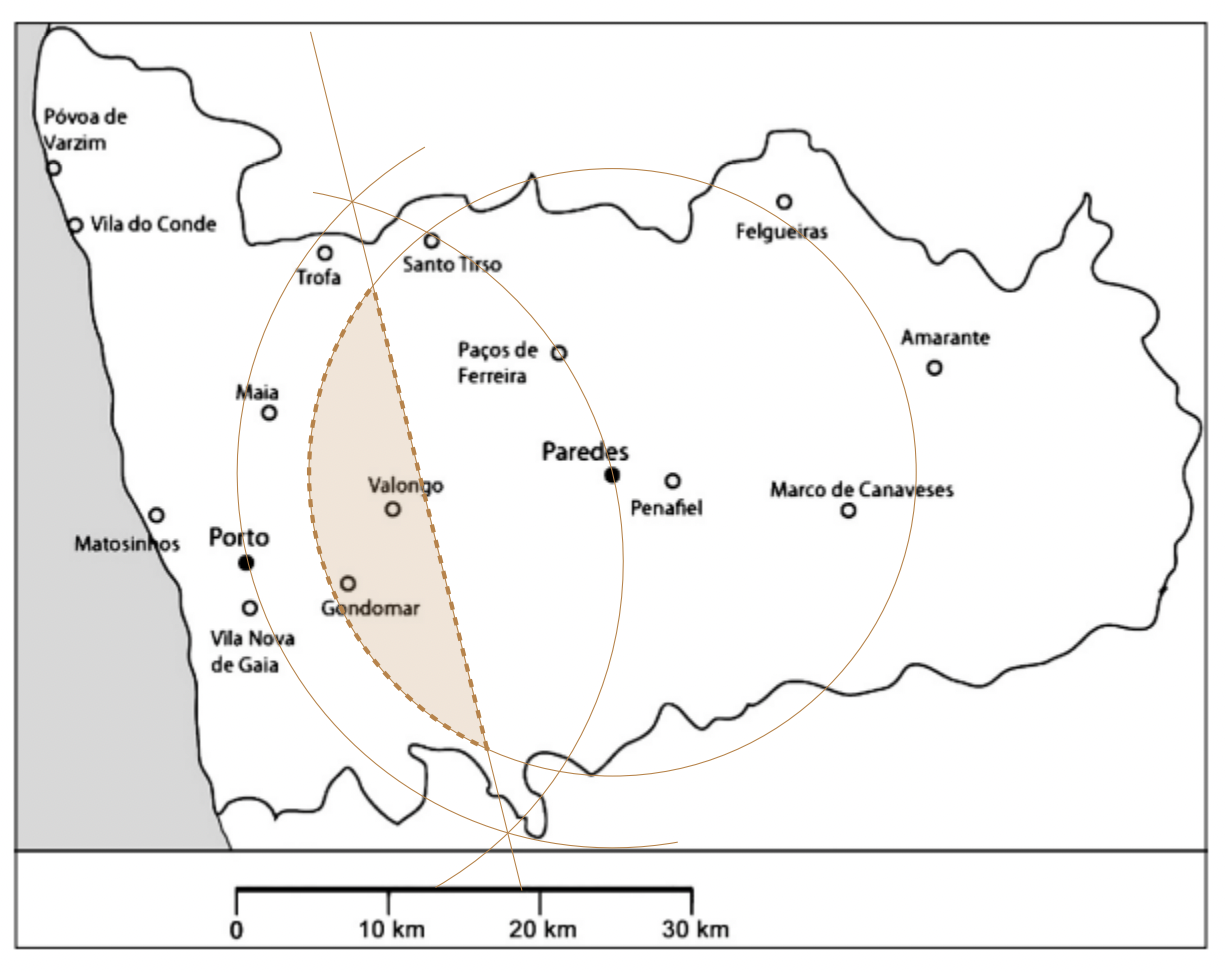 Os pais do Rui vão visitar o Porto e Paredes. Pretendem ficar alojados num local que se situe a menos de vinte quilómetros de Paredes e que seja mais próximo do Porto do que de Paredes.