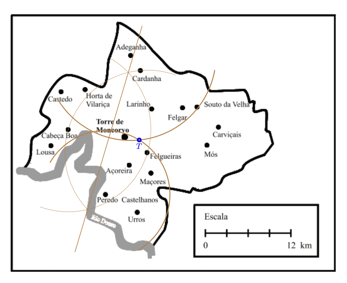 Utilizando um compasso, efectua, a lápis, uma construção que permita encontrar, no mapa, o ponto em que se localiza a torre de vigia. Assinala esse ponto com a letra $T$. Não apagues a construção.