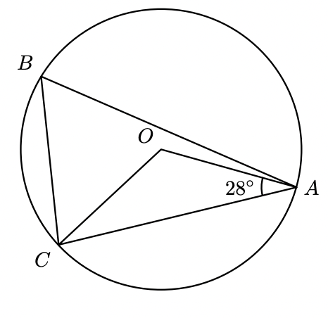 Como o triângulo $[O A C]$ é isósceles porque $\overline{O A}=\overline{O C}$, então os ângulos opostos a lados iguais têm a mesma amplitude, ou seja, $O \hat{C} A=O \hat{A} C=28^{\circ}$, e desta forma, temos que: