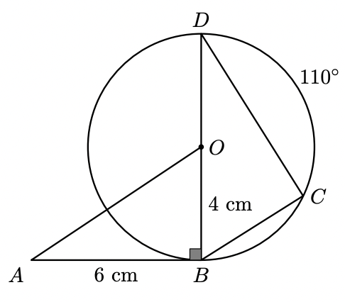 Na figura seguinte, está representada uma circunferência de centro no ponto $O$. Os pontos $B, C$ e $D$ pertencem à circunferência e o ponto $A$ é exterior à circunferência.