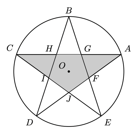 - os vértices $A, B, C, D$ e $E$ da estrela pertencem à circunferência;