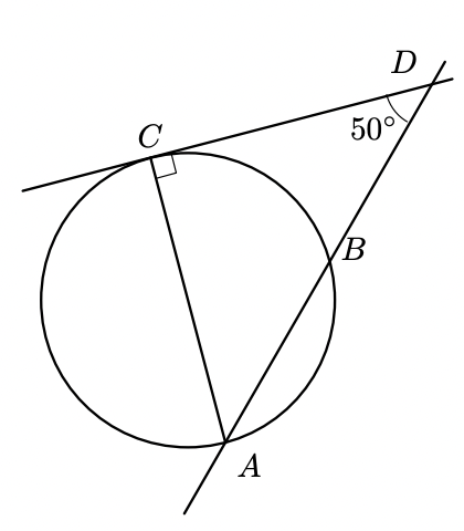 Na figura seguinte, estão representadas as retas $A D$ e $C D$ e a circunferência de diâmetro $[A C]$