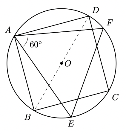 Como o ângulo $E A F$ é um ângulo inscrito, o arco correspondente tem o dobro da amplitude, ou seja, $\overparen{E F}=60 \times 2=120^{\circ}$