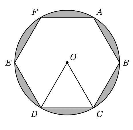 Na figura, está representada uma circunferência de centro $O$, na qual está inscrito um hexágono regular $[A B C D E F]$.