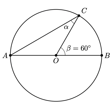 Como os ângulos $A O C$ e $\beta$ são suplementares, e $\beta=60^{\circ}$, então temos que: