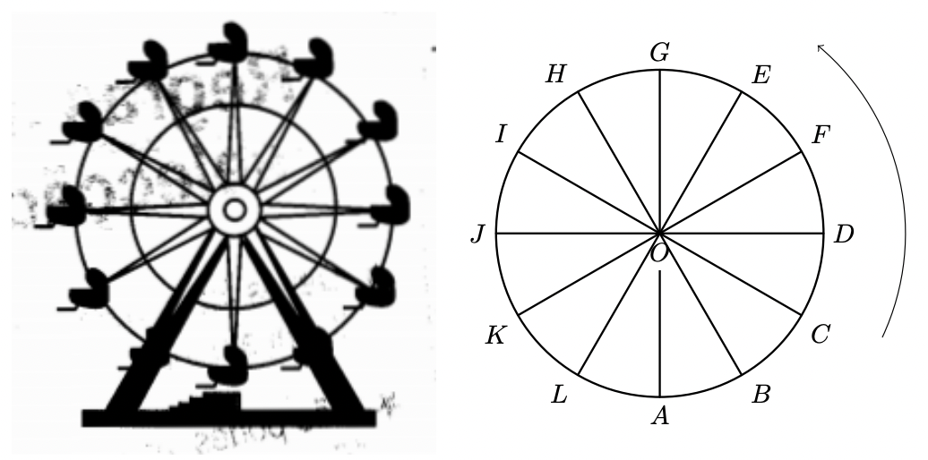 A roda gigante de uma feira de diversões tem 12 cadeiras, espaçadas igualmente ao longo do seu perímetro. O diâmetro da roda é de $10 \mathrm{~m}$, e a roda movese no sentido contrário ao dos ponteiros do relógio.