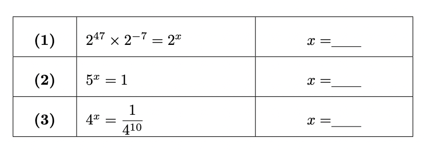 (1) $2^{47} \times 2^{-7}=2^{47+(-7)}=2^{47-7}=2^{40}$, pelo que temos que se $2^{40}=2^{x}$, então $x=40$