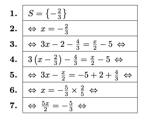 - $\quad \Leftrightarrow 3 x-\frac{x}{2}=-5+2+\frac{4}{3} \Leftrightarrow\quad$ Isolar os termos com incógnita num dos membros.