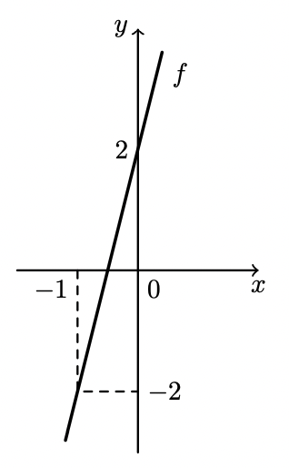 Na figura ao lado, está representada, num referencial cartesiano, parte do gráfico de uma função afim, $f$, que contém os pontos de coordenadas $(-1,-2)$ e $(0,2)$.