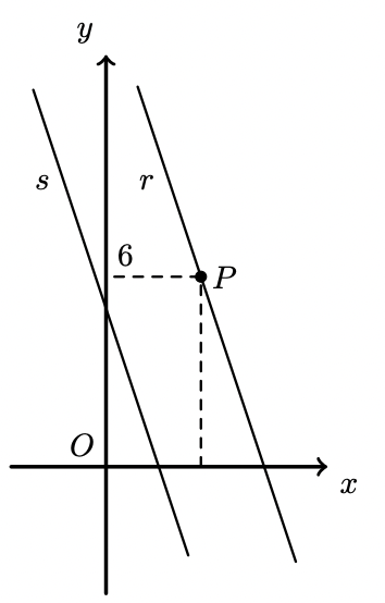 Na figura seguinte, estão representados, em referencial cartesiano, de origem no ponto $\mathrm{O}$, as retas $r$ e $s$ e o ponto $P$.