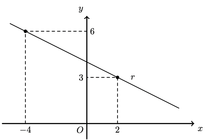 Como a reta $r$ contém os pontos de coordenadas $(-4,6)$ e $(2,3)$, então podemos calcular o valor do declive: