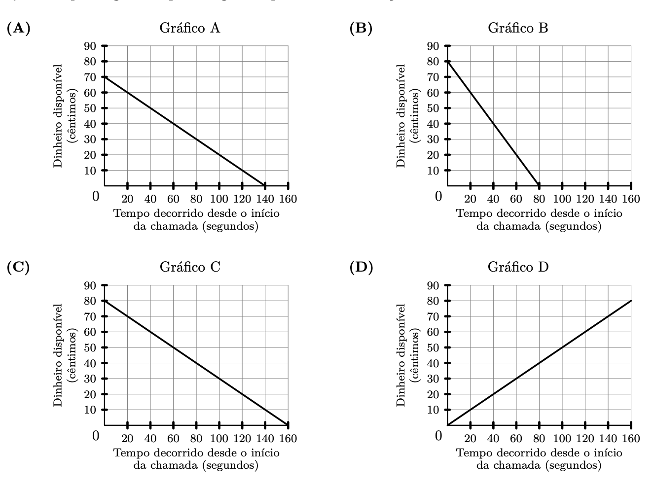 Após ter iniciado uma chamada para a rede A, o dinheiro disponível foi diminuindo, até ser gasto na sua totalidade.Qual dos quatro gráficos que se seguem representa esta situação?