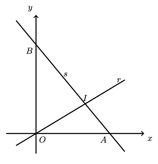 Como o ponto $I$ pertence à reta $r$ e também à reta $s$, as suas coordenadas verificam as equações de ambas as retas, ou seja, as coordenadas do ponto $I$ é a solução do sistema