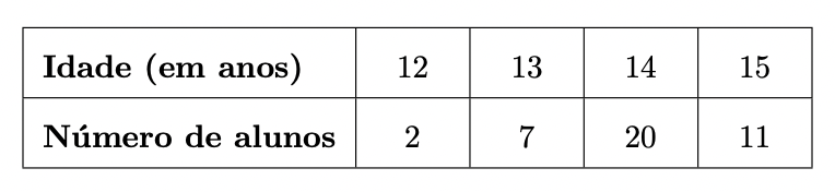 Na tabela seguinte, apresentam-se dados relativos às idades de uma amostra de alunos do $3 .^{\circ}$ ciclo de uma escola básica.