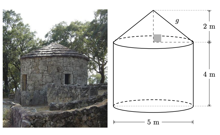 A figura da direita representa um modelo geométrico dessa casa. Este modelo é um sólido que pode ser decomposto num cilindro reto e num cone reto.