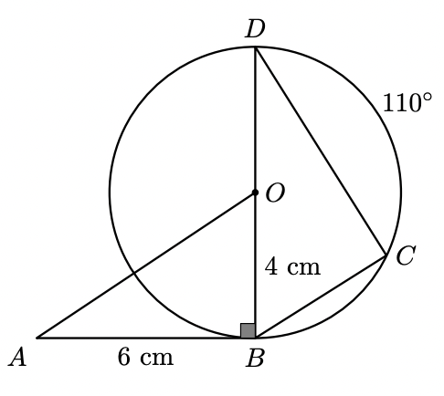 Na figura ao lado, está representada uma circunferência de centro no ponto $O$. Os pontos $B, C$ e $D$ pertencem à circunferência e o ponto $A$ é exterior à circunferência.