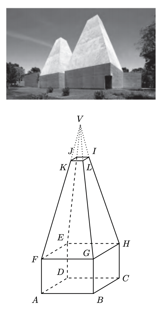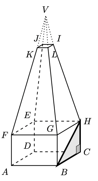 No esquema, estão representados o prisma reto de bases quadradas $[A B C D E F G H]$ e o tronco de pirâmide $[E F G H I J K L]$, da pirâmide reta de base quadrada $[E F G H V]$. As faces $[E F G H]$ e $[I J K L]$, do tronco de pirâmide, são paralelas.