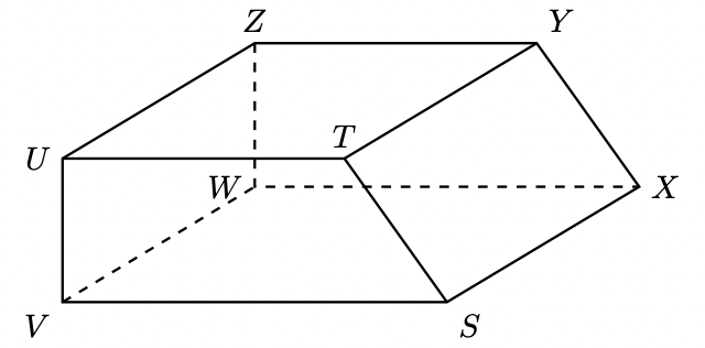 Na figura seguinte, está representado o prisma reto $[S T U V W X Y Z]$, que é o esquema da secção inclinada de uma cama articulada. As bases do prisma são trapézios.