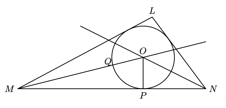 Na figura seguinte, estão representados o triângulo escaleno $[L M N]$, as semirretas $\dot{M} O$ e $\dot{N} O$, bissetrizes dos ângulos $L M N$ e $M N L$, respetivamente, e a circunferência inscrita no triângulo $L M N$.