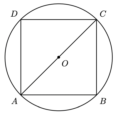 Na figura seguinte, está representada uma circunferência de centro $O$, na qual está inscrito um quadrado $[A B C D]$