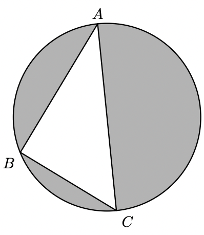 A área da região sombreada, $A_{S}$, pode sr calculada como a diferença da área do círculo e da área do triângulo, pelo que calculando a área da região sombreada e escrevendo o resultado arredondado às unidades, temos