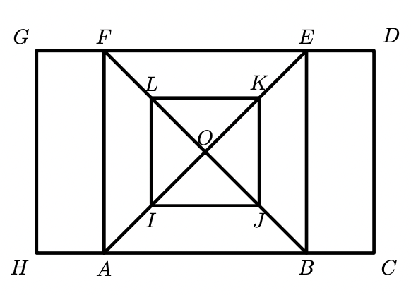 A interseção das diagonais dos dois quadrados é o ponto $O$. Os lados $[C D]$ e $[H G]$ do retângulo $[H C D G]$ são paralelos aos lados $[B E]$ e $[A F]$ do quadrado $[A B E F]$ e $[C D]$ mede o triplo de $[B C]$.