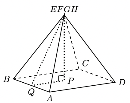 A altura da pirâmide é o segmento $[P F]$, e como a altura á perpendicular à base, o triângulo $[Q P F]$ é retângulo, pelo que, recorrendo ao Teorema de Pitágoras, calculamos a altura da pirâmide, ou seja a medida do comprimento do segmento $[P F]$ :