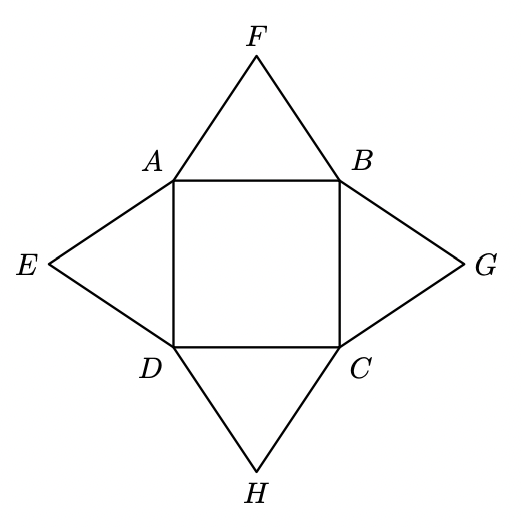 Na figura seguinte, estão representados um quadrado $[A B C D]$ e quatro triângulos geometricamente iguais.