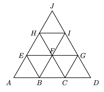 O triângulo equilátero $[A D J]$ da figura está decomposto em nove triângulos geometricamente iguais.