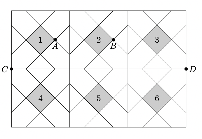 Na figura seguinte, está representado um painel formado por seis azulejos quadrados todos iguais. Em cada azulejo pintou-se um quadrado cinzento cujas diagonais são paralelas aos lados do azulejo e se intersectam no centro deste.