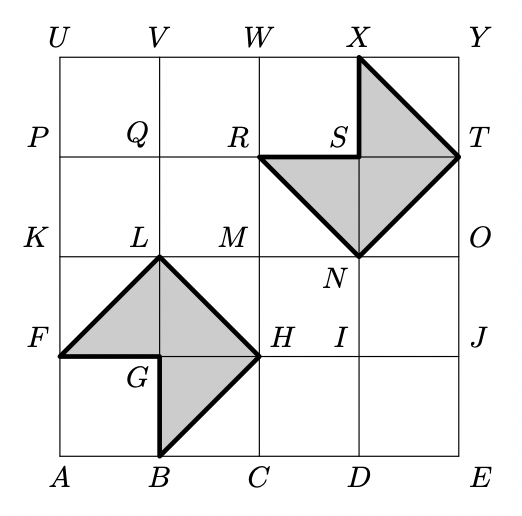 Os pentágonos $[B H L F G]$ e $[N T X S R]$ são geometricamente iguais e têm os seus vértices coincidentes com vértices de quadrados da figura.