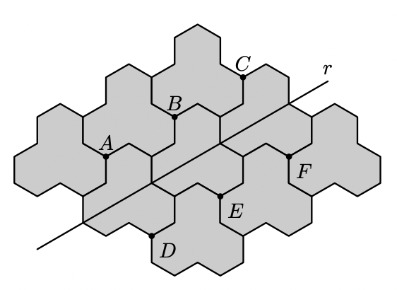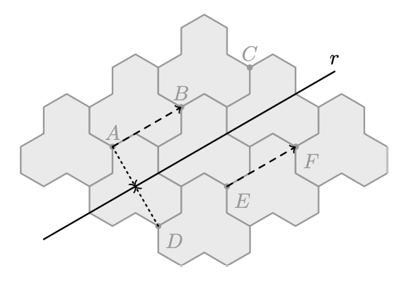 Os pontos $A, B, C, D, E$ e $F$, assinalados na figura, são vértices desses polígonos, e a reta $r$ é a mediatriz dos segmentos de reta $[A D],[B E]$ e $[C F]$.