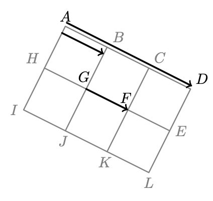 E assim, temos que a imagem do ponto $G$ pela translação associada ao vetor $\frac{1}{3} \overrightarrow{A D}$, ou seja, ao vetor $\overrightarrow{A B}$, é: o ponto $F$