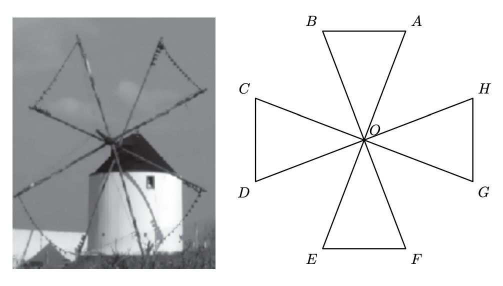 Na figura da direita, está representado um esquema das velas de um moinho de vento.