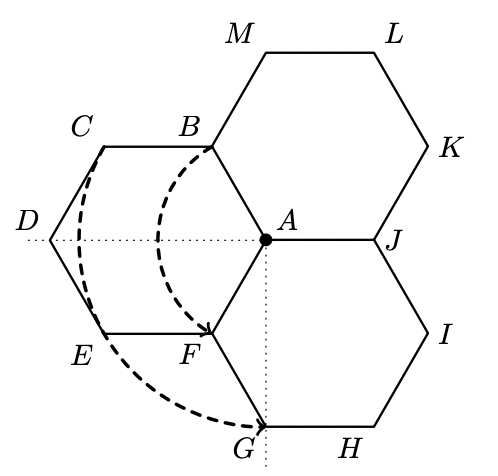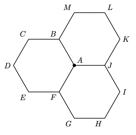 Na figura seguinte, estão representados três hexágonos regulares com os vértices designados pelas letras de $A$ a $M$. Cada um dos segmentos $[A B],[A F]$ e $[A J]$ é comum a dois dos hexágonos.