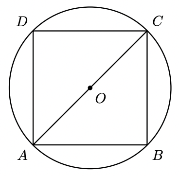 Na figura seguinte, está representada uma circunferência de centro $O$, na qual está inscrito um quadrado $[A B C D]$