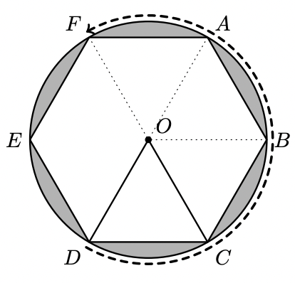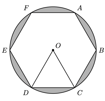 Na figura seguinte, está representada uma circunferência de centro $O$, na qual está inscrito um hexágono regular $[A B C D E F]$
