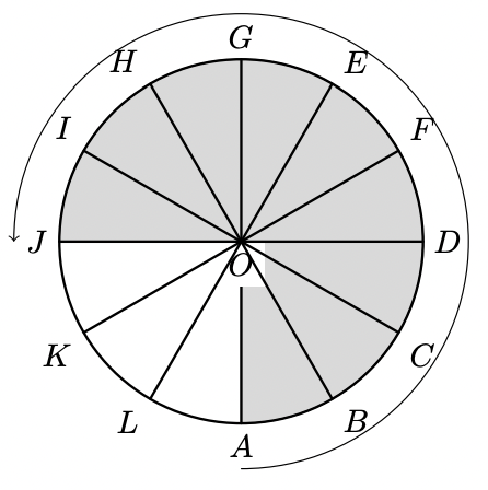 Assim, após completar os restantes $\frac{3}{4}$ de volta a cadeira da Rita estará na posição assinalada com a letra $J$