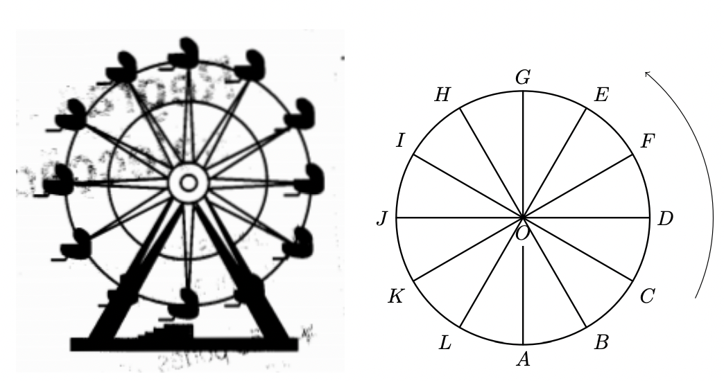 A roda gigante de uma feira de diversões tem 12 cadeiras, espaçadas igualmente ao longo do seu perímetro.