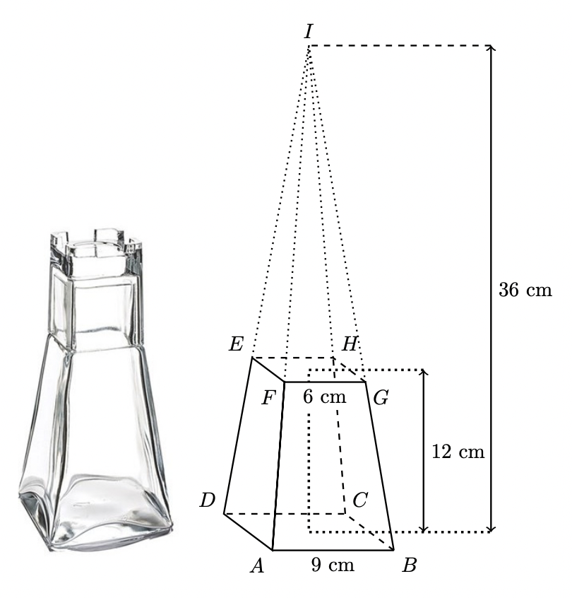 - a altura da pirâmide $[A B C D I]$ é $36 \mathrm{~cm}$ e a altura do tronco de pirâmide é $12 \mathrm{~cm}$;
