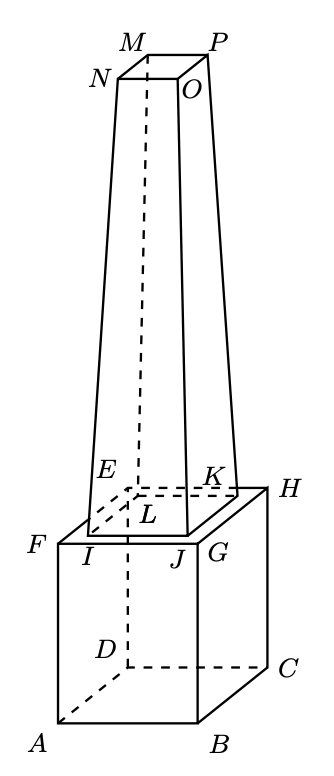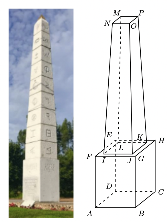 O volume do obelisco representado $\left(V_{O}\right)$, pode ser obtido pela soma dos volumes do paralelepípedo $\left(V_{[A B C D E F G H]}\right)$ e do tronco de pirâmide $\left(V_{[I J K L M N O P]}\right)$; e o volume do tronco de pirâmide $\left(V_{[I J K L M N O P]}\right)$, pode ser obtido pela diferença entre o volume da pirâmide $\left(V_{P}\right)$ e da parte da pirâmide que não pertence ao obelisco - que também é uma pirâmide $\left(V_{p}\right)$.