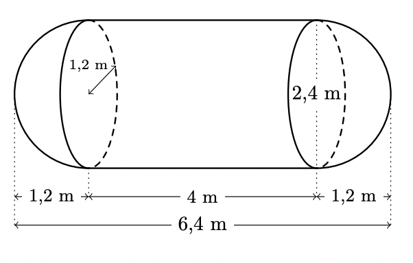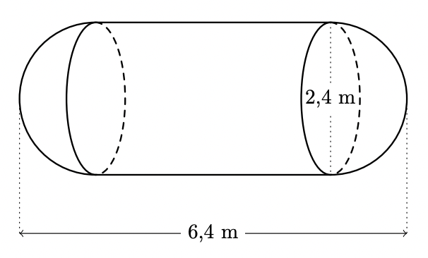 Como o comprimento da cisterna é $6,4 \mathrm{~m}$, a altura do cilindro $(h)$ pode ser calculado subtraindo os raios das semiesferas ao comprimento da cisterna: