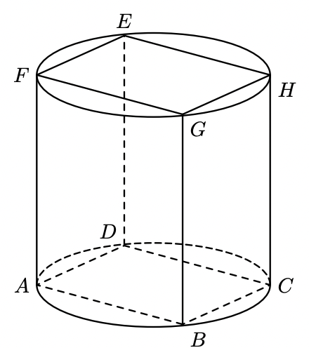 Na figura ao lado, estão representados um cilindro e um prisma quadrangular regular $[A B C D E F G H]$ de bases $[A B C D]$ e $[E F G H]$, inscritas nas bases do cilindro. A altura do cilindro é igual a $5,3 \mathrm{~cm}$ e o raio da sua base é igual a $3 \mathrm{~cm}$. A figura não está desenhada à escala.