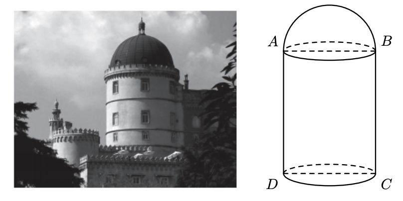 A figura da direita é uma fotografia de uma das torres desse palácio. Na figura da esquerda, está representado um modelo geométrico dessa torre.
