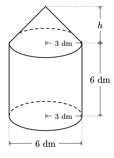 Logo temos que o volume do cone $\left(V_{C o}\right)$, em decímetros cúbicos, é a diferença entre o volume total do sólido $\left(V_{T}\right)$ e o volume do cilindro: