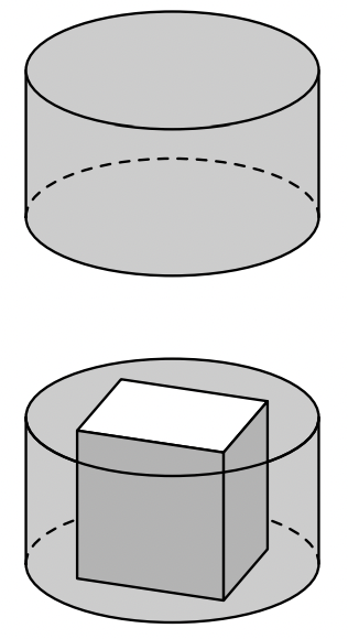 Como o recipiente cilíndrico estava cheio, o volume de líquido que transbordou é igual ao volume do cubo, pelo que o volume de líquido que ficou no recipiente ( $V_{\text {Final }}$ ) é a diferença entre o volume do cilindo ( $V_{\text {Cilindro }}$ ) e o volume do cubo ( $\left.V_{\text {Cubo }}\right)$ :